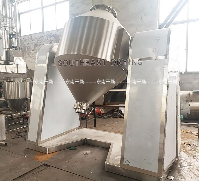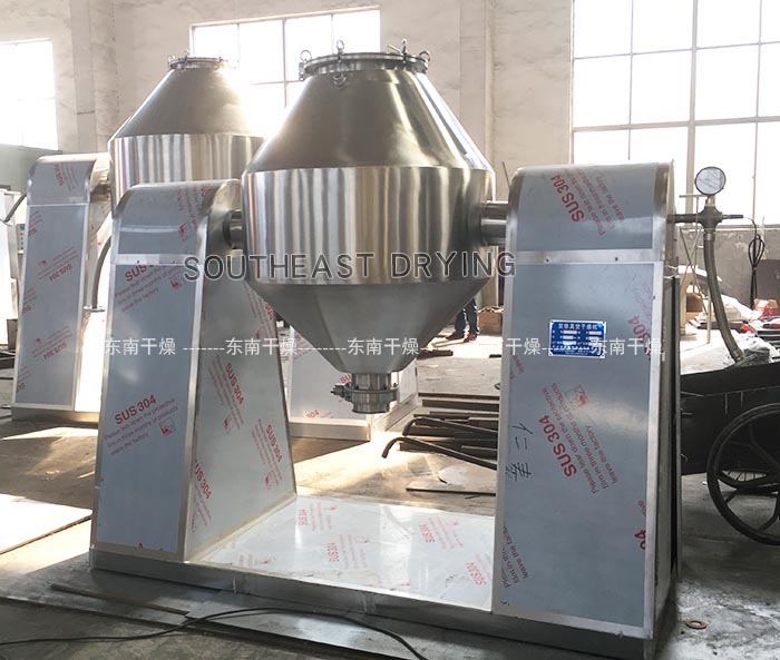 本機將粉末或粒狀物料通過真空輸送或人工加料到雙錐容器中,隨著容器的不斷旋轉(zhuǎn),物料在容器中進(jìn)行復(fù)雜的撞擊運動,達(dá)到均勻的混合。